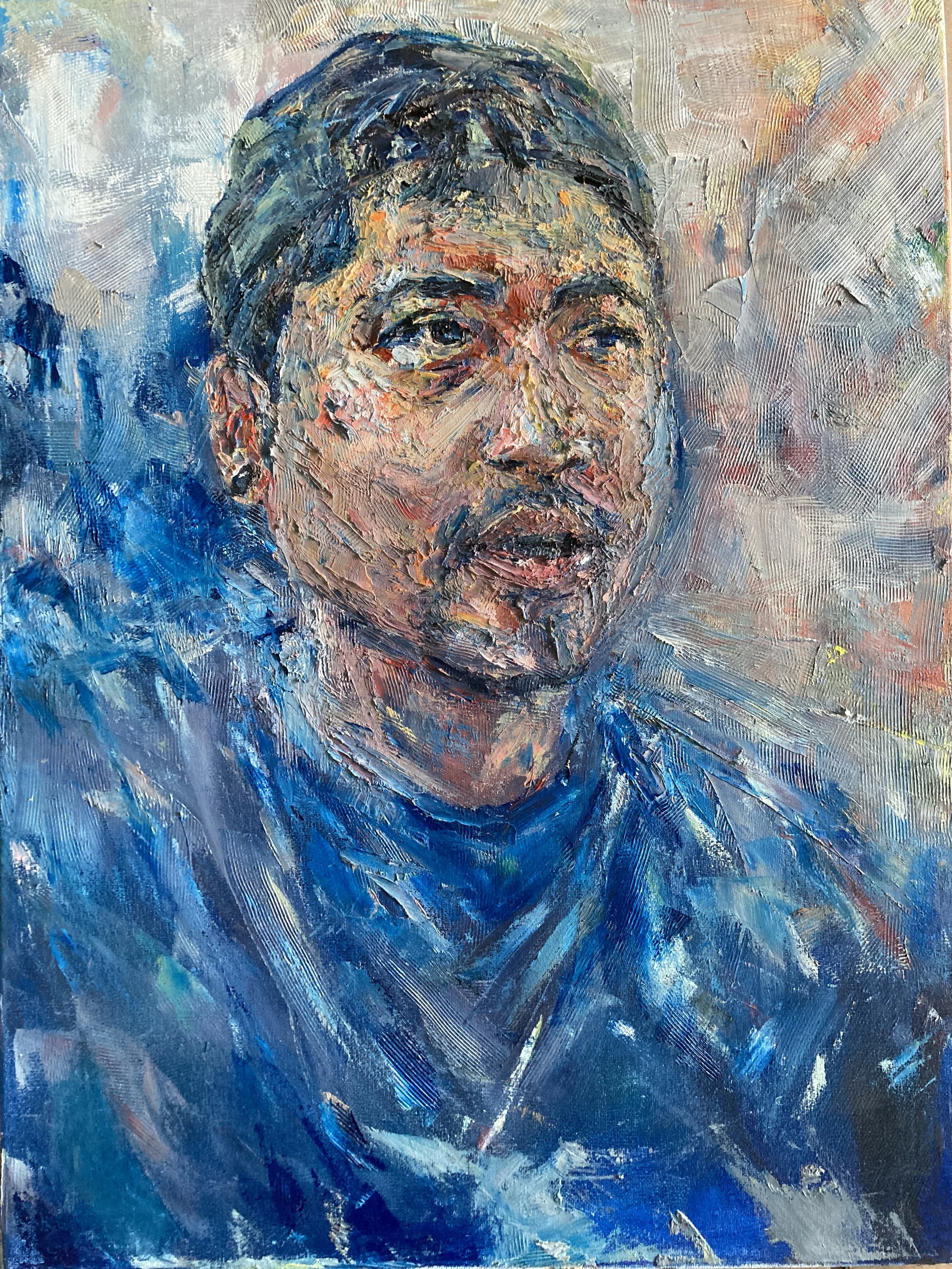 Portrait of Moises. 24″x18″. Oil on Canvas w/ Plastic Fork and Knife.